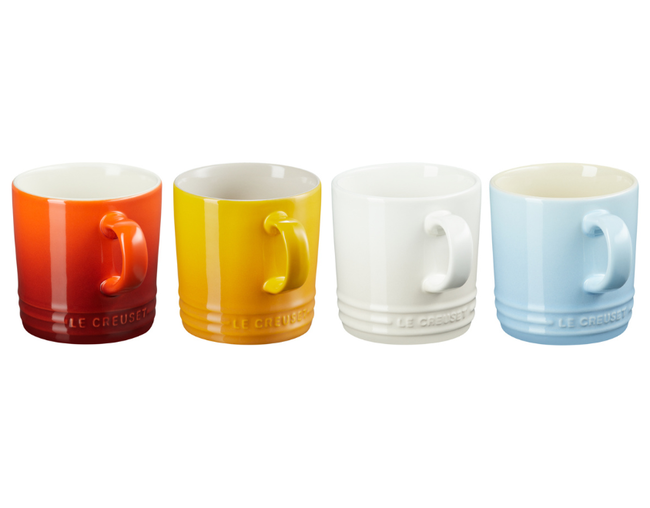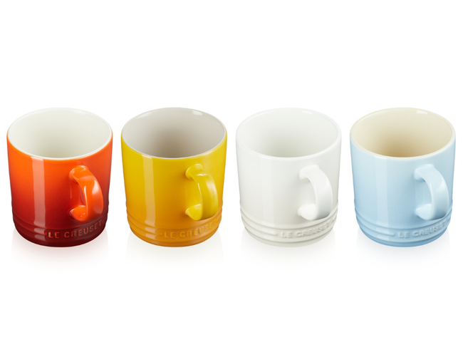 O Set 4 Canecas 350ml segue o modelo de nossa caneca tradicional, perfeita para café, chá, chocolate quente e até porções individuais de sopa e sobremesa. Feitas com cerâmica premium em nossas cores irresistíveis, as canecas fazem parte de nossa coleção de louças e a superfície esmaltada facilita a remoção dos alimentos, tornando o processo de limpeza mais rápido e pode ser lavado na máquina de lavar louça. Projetada para ficar bonita no uso diário, a louça Le Creuset traz um estilo elegante para cada mesa e ocasião.
